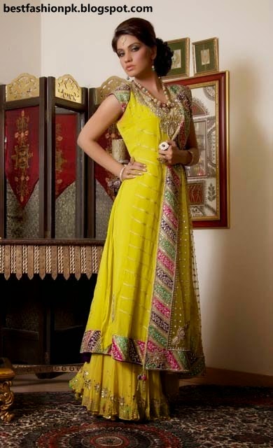 Mehndi event is very important in Asian wedding. specially in Pakistan bridal used to wear yellow, green or red combinations dresses on Mahndi event. bride in yellow color looks more pretty and beautiful. now a days fashion changed every day but we see our brides still wants to wear yellow combination dresses. that's why designers works a lot on that colours that are specially made for this event. they are using different colours like dark yellow, light pink, mejanda, sky blue combinations. they are using more than 3 colors in one dress. Those dresses looks more beautiful in very unique combination. Girls usuallywants to wear churi daar pajamas, shararas, shalwar qameez, long shirts, anarkali frocks, long frocks.we are going t present some very beautiful and unique dresses for Mehndievent. just have a look. we'll hope you will like these dresses.